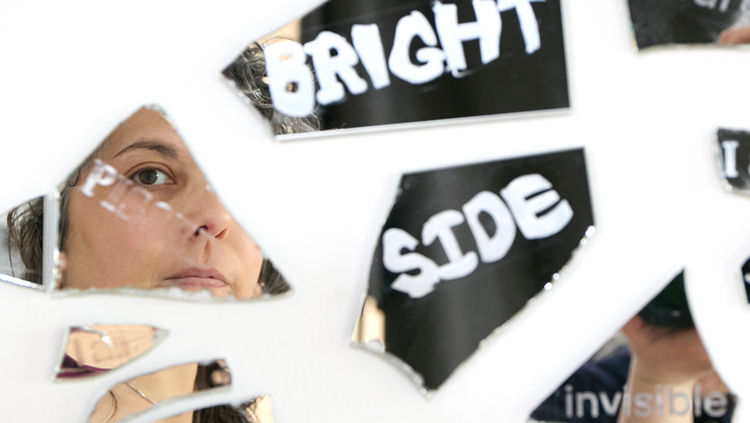 broken mirrors etched with words and phrases around hysteria and toxic positivity